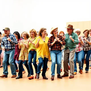 6. A group of people of all ages, from young adults to seniors, standing in a line formation, wearing casual clothing and dance shoes, performing a choreographed line dance routine to the rhythm of upbeat country music, with simple yet varied step patterns, showcasing coordination and unity, in a bright and colorful setting, with a hint of rustic and folk elements, inspired by the styles of folk artists such as Norman Rockwell, Thomas Hart Benton, and Grandma Moses.